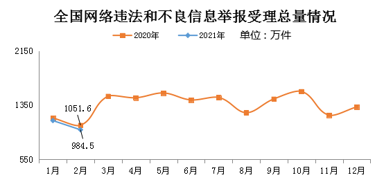 2021年2月全国受理网络违法和不良信息举报984.5万件