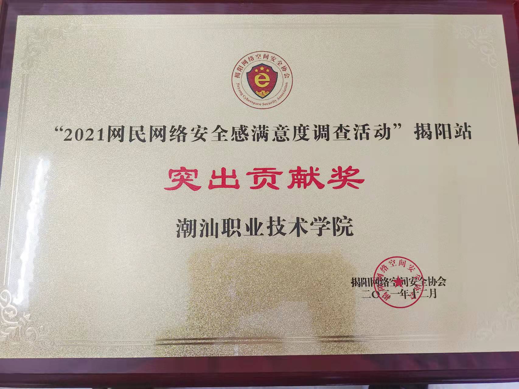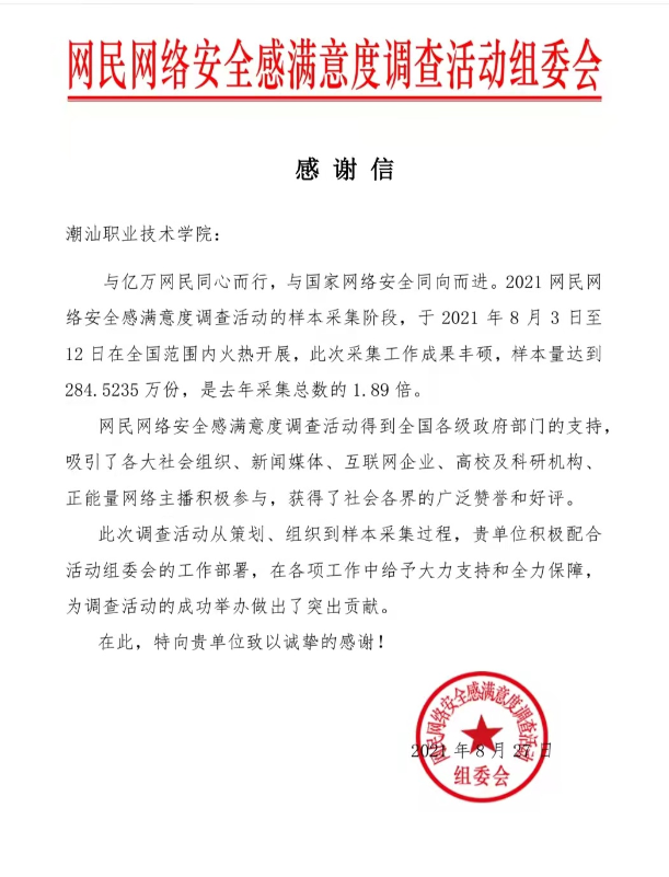 2021年8月3日至12日,2021网民网络安全感满意度调查活动火热开启,本次在我校网络与信息化中心的积极动员下,采集工作成果丰硕,获得揭阳站2021网民网络安全感满意度调查活动突出贡献奖。