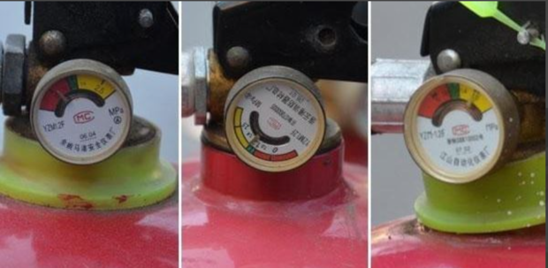 1.注意:经常检查灭火器压力阀,指针应指在绿色区域,红色区域代表压力不足,黄色代表压力过高。